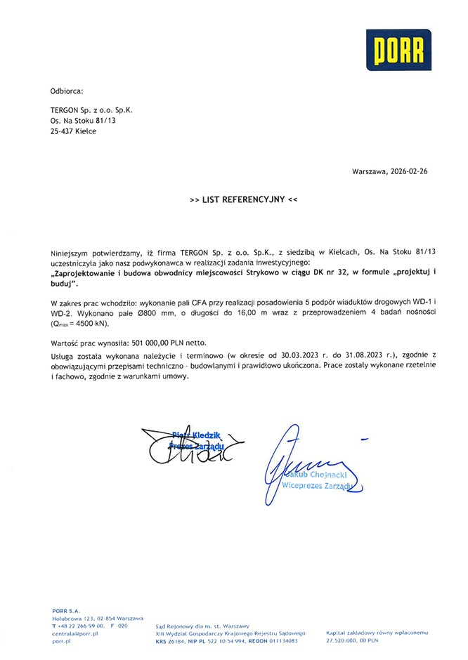 PORR – posadowienie podpór drogowych na obwodnicy Strykowa [2026]Tranzyt – wykonanie poziomej przesłony przeciwfiltracyjnej oraz pionowej przegrody [2026]Tranzyt – wykonanie poziomej przesłony przeciwfiltracyjnej [2026]Hoben – wykonanie mikropali na terenie hali jako posadowienie pod wtryskarki [2026]TERLAN – wykonanie posadowienia ściany operowej na styku czynnego torowiska tramwajowego i zabytkowego budynku [2025]MALBUD 1 – palisada żelbetonowa w „Mieście Polskich Mistrzów Olimpijskich” [2025]ARCUS – wykonanie fundamentu z mikropali pod nowym łącznikiem w Wojewódzkim Ośrodku Medycyny Pracy [2025]Roboz – wykonanie mikropali na terenie drogi startowej Lotniska Chopin w Warszawie [2025]Baubud – zabezpieczenie budynków przed wpływem głębokiego wykopu w Warszawie. [2025]Intemo – prace na terenie zakładu w Rzeczycy w celu posadowienia pośredniego z zastosowaniem mikropali [2025]Budimex – ochrona przeciwpowodziowa doliny rzeki Nysy Kłodzkiej [2025]Budimex – wykonanie fundamentów przyczółku mostu i palisady zabezpieczających wykopy [2025]Hoben – wykonanie posadowienia pośredniego z pali CFA [2025]Skanska – Bardo – gwoździowanie, bariera mikropalowa, dreny [2024]Pijanowski – Ciechanów – kolumny jet-grouting [2024]Opara – Kielce ul. Silniczna – kolumny jet-grouting, kolumny FDP, pale VdW [2024]Opara – Kielce ul. Silniczna – kolumny FDP, pale VdW [2023]Opara – Kielce – Opara – palisada CFA, kolumny przemieszczeniowe [2023]Nowbud – palisada CFA [2023]Gulermak – metro – przesłona przeciwfiltracyjna jet grouting [2022]NDI – Gazociąg Strachocina – Pogórska Wola – palisady z mikropali, oczepy żelbetowe [2019]Budimex – modernizacja linii kolejowej LK7 – gwoździe gruntowe [2019]Mostostal Warszawa S.A. – budowa sali koncertowej Toruń – torkret [2019]Webuild – Astaldi – Południowa Obwodnica Warszawy – torkret, palisada [2019]Strabag – obwodnica Wolbromia – gwoździe gruntowe [2019]PLAY – stacje bazowe telefonii – mikropaleIKEA Polska – zabezpieczenie ściany oporowej Katowice – kotwy gruntoweWarbud – budynek biurowy Gdańsk – kotwy gruntoweGeocomp – hotel Warszawa – kotwy gruntoweOpara – apartamentowiec – palisada CFA, kolumny przemieszczenioweMalbud – budynek mieszkalny – palisada CFANowbud – palisada CFABIP – Bóźnicza Poznań – mikropaleElpator – zabezpieczenie osuwiska – gwoździe gruntowePDiM Dębica – budowa dróg Tarnów – mikropaleDRU Piotr Drulis – stacja bazowa PLAY – mikropaleWPM Mosty – przebudowa mostu Szczaki – mikropaleWPM Mosty – remont wiaduktów Sady – kotwy gruntoweQuick-Mix – naprawa konstrukcji żelbetowej Warszawa – torkretBaugrupp Sp. z o.o. – roboty naprawcze mostu – siatka zbrojeniowa, kotwy, torkretSPS Construction Sp. z o.o. – wzmocnienie posadowienia ściany szczytowej Warszawa – mikropaleUnit Lublin – budynek mieszkalny Lublin – kotwy gruntoweIntop – przebudowa mostu Krzeszyce – mikropaleIwotel – sieci bazowe telefonii Play – mikropaleElektrobudowa – SkawinaKamaro – Zamek Lubawa – mikropaleUnit Lublin – budynek mieszkalny – kotwy gruntowe